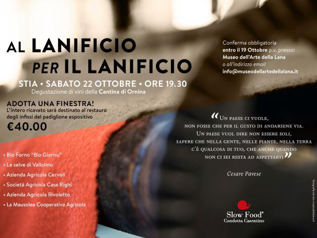 "At Lanificio for the Lanificio, adopt a window", was the first of a series of initiatives aimed at raising funds for the restoration of the fixtures of the exhibition pavilion, better known as Salone a Volta of the Lanificio di Stia, which took place on Saturday October 22nd 2016 at the Museo dell'Arte della Lana in Stia. The tasting of wines and typical products of the territory, followed by a guided tour of the Museo dell'Arte della Lana, has seen the participation of many Casentinesi whose contribution will allow the restoration of three windows and the realization of the new exit door safety. "Adopt a window",
